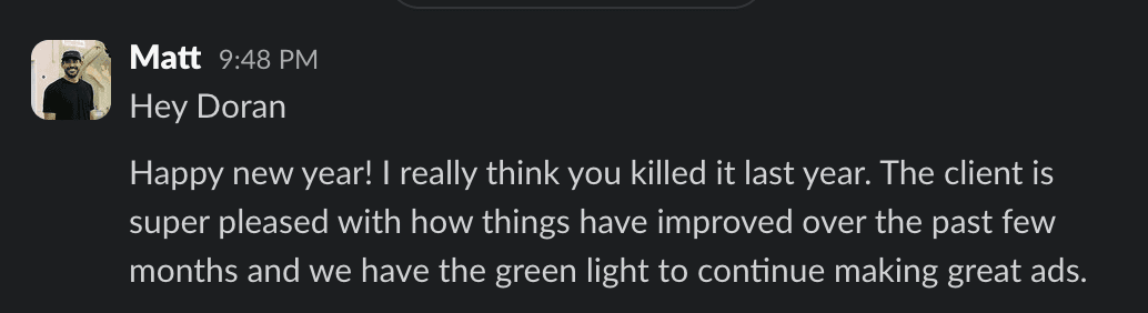Doran is an American creative strategist and direct response specialist based in Paris, with seven years of professional video editing experience. He's worked with marketing teams at DraftKings, SamCart, and ManyChat, producing high-performing ad creative.